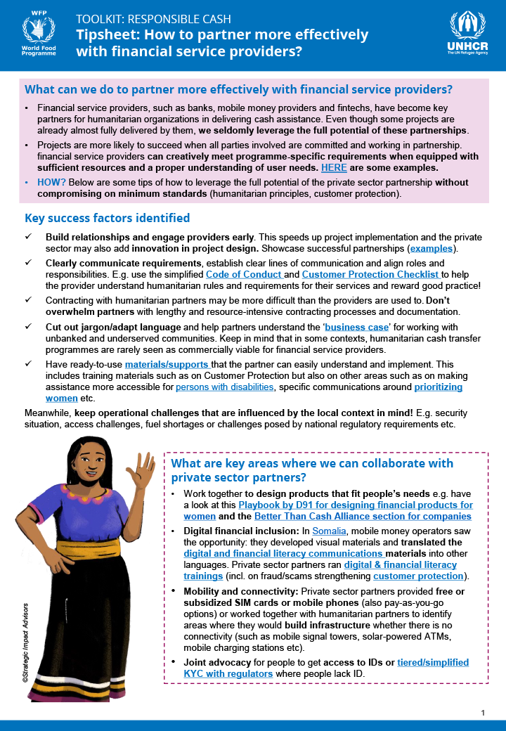 Tools in this section are designed to help humanitarian/development teams build effective partnerships with financial service providers and engage with merchants on e-payments. It outlines strategies to help providers recognize disadvantaged communities as valuable clients and highlights success factors for the partnership (early engagement, clear communication, simplified contracting). Case studies further help illustrate the business case for serving unbanked and hard-to-reach communities.