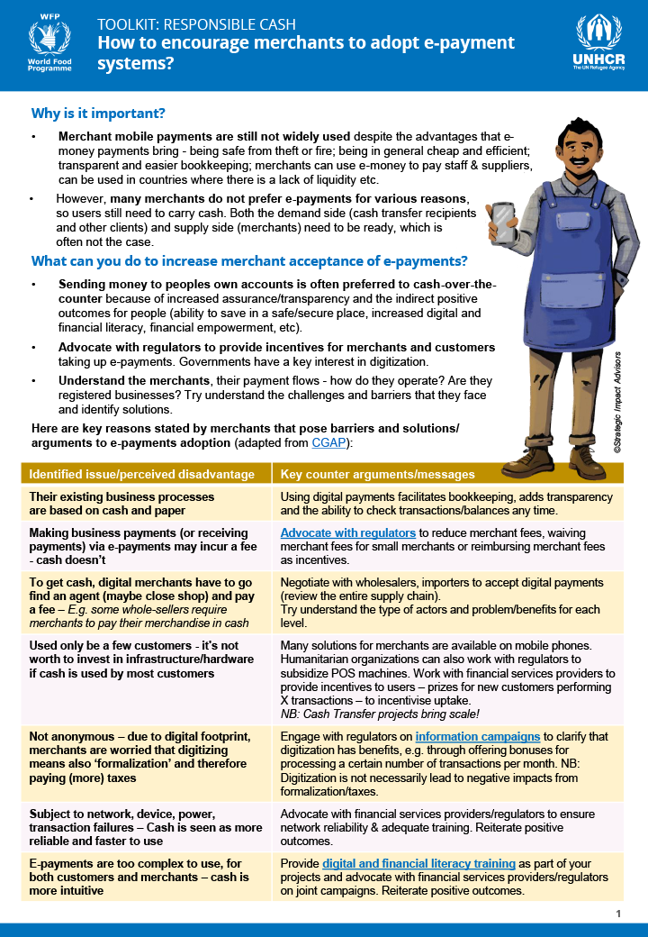 Tips to drive merchant e-payment adoption. Merchant mobile payments are still not widely used despite the advantages that e-money payments bring, including recipients of digital cash assistance. This includes increased privacy and convenience of paying for goods and services directly through people’s own mobile money accounts or e-wallets. This tool explains why merchant e-payments matter […]